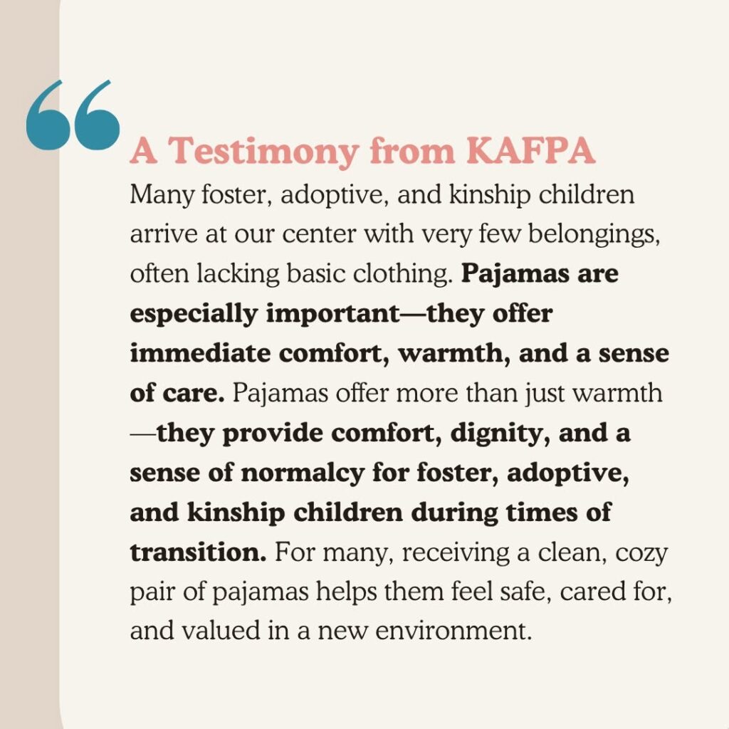 We are committed to fostering a culture of generosity, compassion, and collaboration, and to building meaningful partnerships with individuals, organizations, and businesses who share our vision. Together, we can make a lasting impact on the lives of children and help them to build a brighter future. Pajama PLUS Project is dedicated to supporting children and families experiencing hardship. We serve foster and adoptive youth, young people residing in youth shelters, survivors and families seeking refuge in women’s shelters, and children in need of stability, care, and hope. Through advocacy, community connection, and essential resources, we strive to help every child feel valued, supported, and safe.